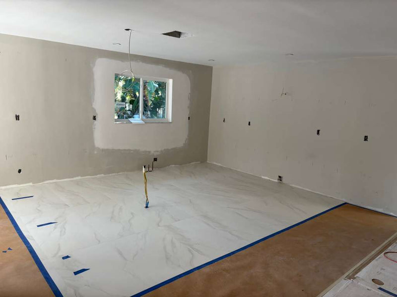 This is the before stage of the kitchen, showing the space unfinished with new marble look flooring already installed. The walls are still in the drywall phase with visible patches and no cabinets, appliances, or fixtures yet. Electrical outlets and wiring are exposed, and the room is clearly prepared for the full kitchen installation that comes next.