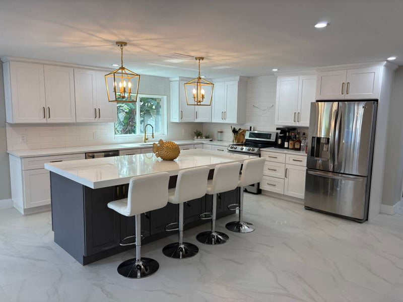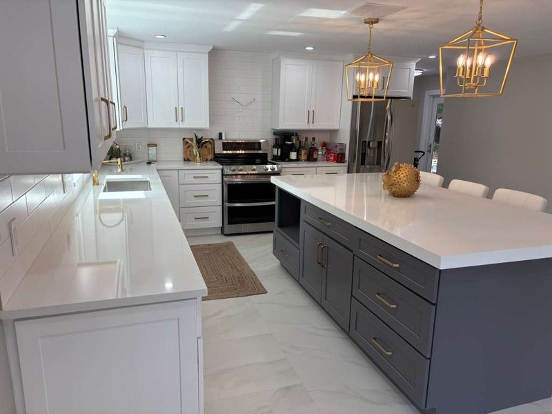 This is the completed kitchen, featuring bright white cabinets, a sleek gray island, polished quartz countertops, and modern gold hardware. The lighting fixtures add a warm touch, while the stainless steel appliances and marble look floors create a clean and elegant finish. The space is fully transformed and ready to use.